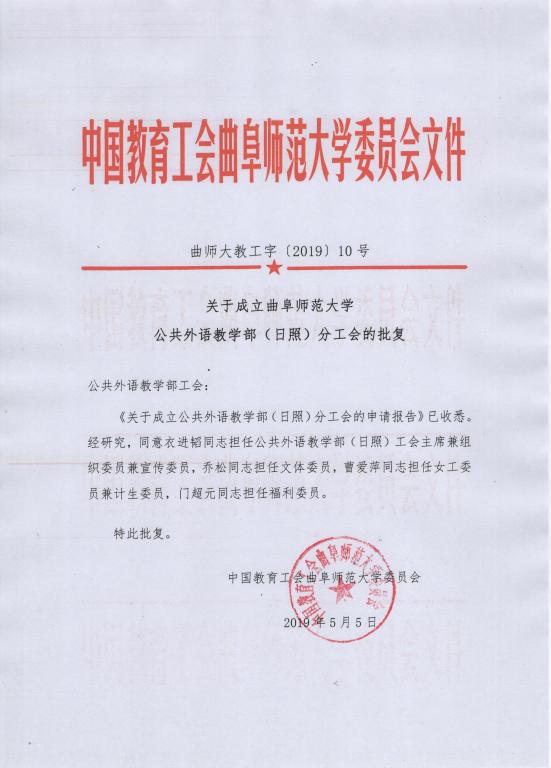 曲师大教工字〔2019〕10号关于成立宝威官方网站宝威baowei(中国)(日照)分工会的批复