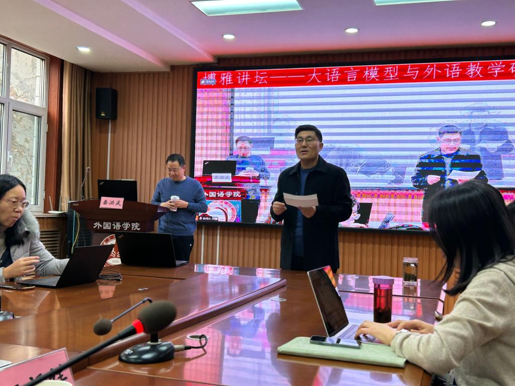 王福祥教授在开场致辞中首先对秦洪武教授表示了衷心的感谢。他指出,在当前科技飞速发展的背景下,大语言模型已成为人工智能领域的研究热点,并对教育领域产生了深远的影响。外语教育作为培养国际化人才的重要一环,亟需关注并研究大语言模型带来的机遇与挑战。因此,本次讲座不仅具有重要的学术价值,对公共外语教学的未来发展也具有指导性意义。