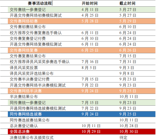 1、大赛主赛事为交替传译,采用初赛、复赛、半决赛、总决赛四级赛制。